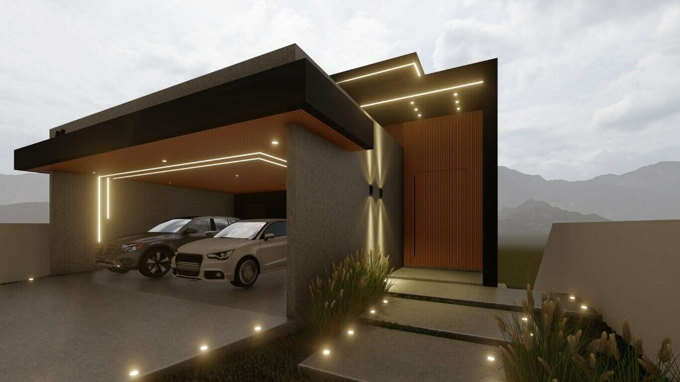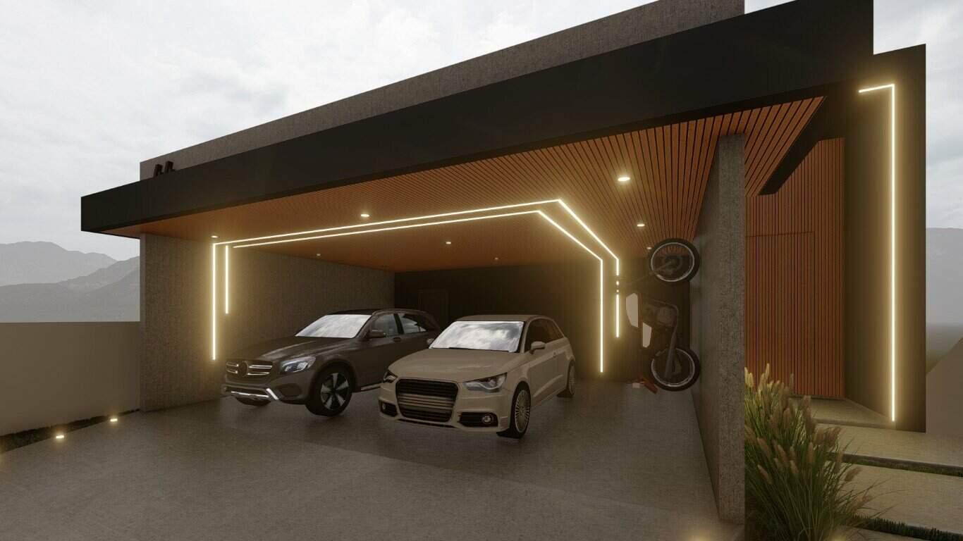 A residência possui uma garagem espaçosa para três carros, garantindo praticidade e segurança.