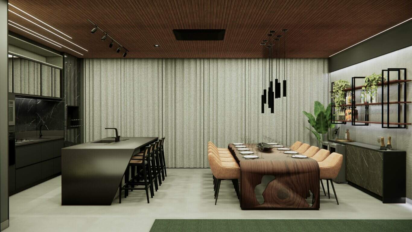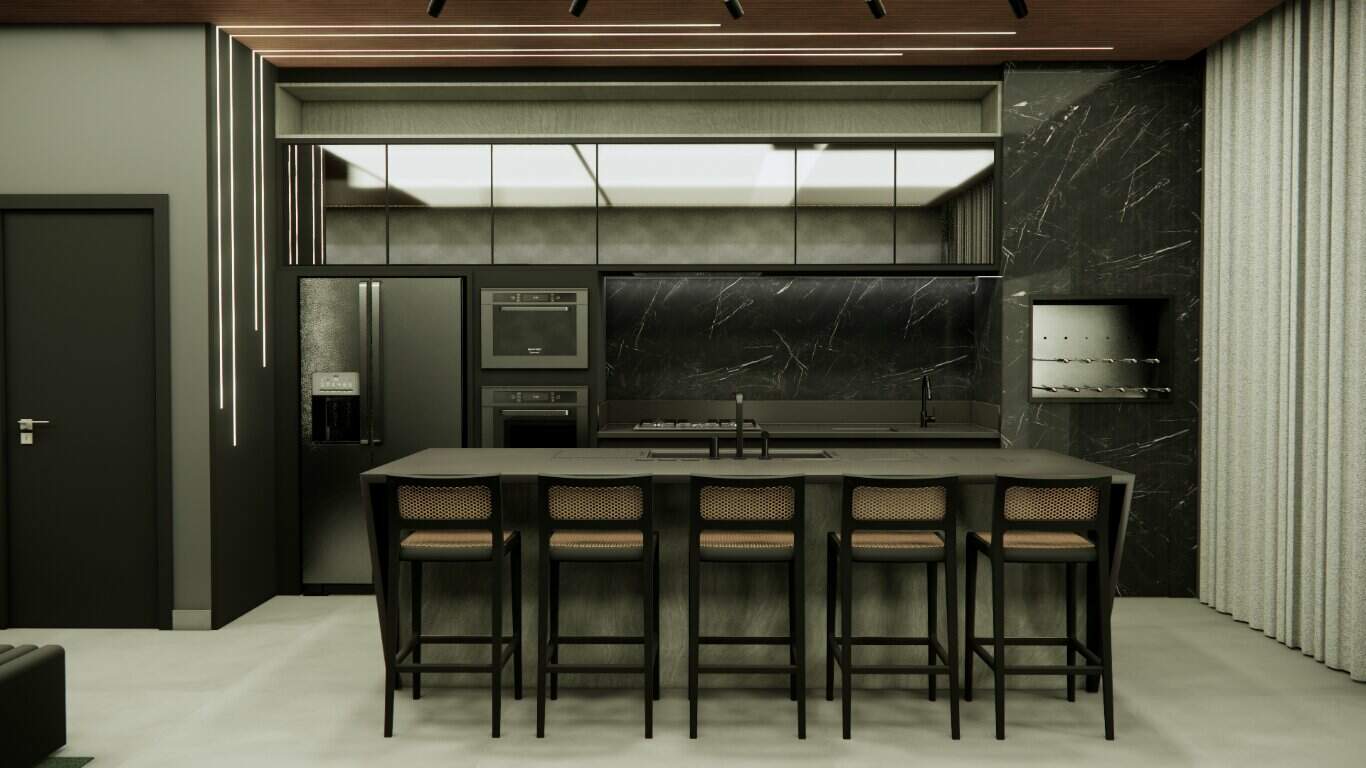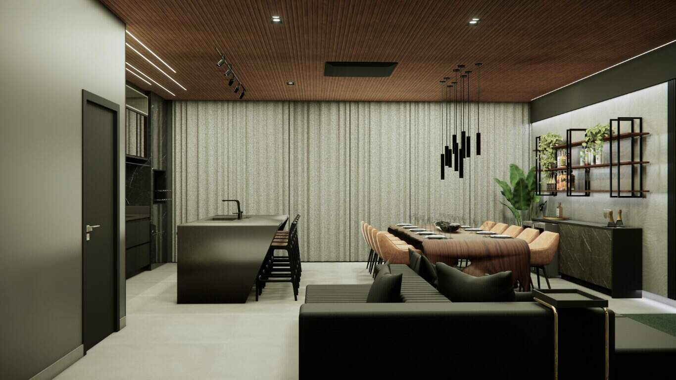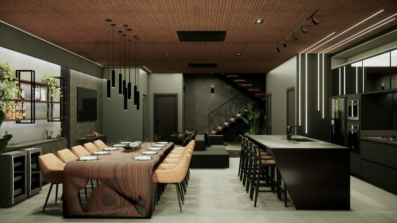O design integrado da sala e da cozinha promove um ambiente harmonioso e acolhedor, perfeito para momentos de convivência.