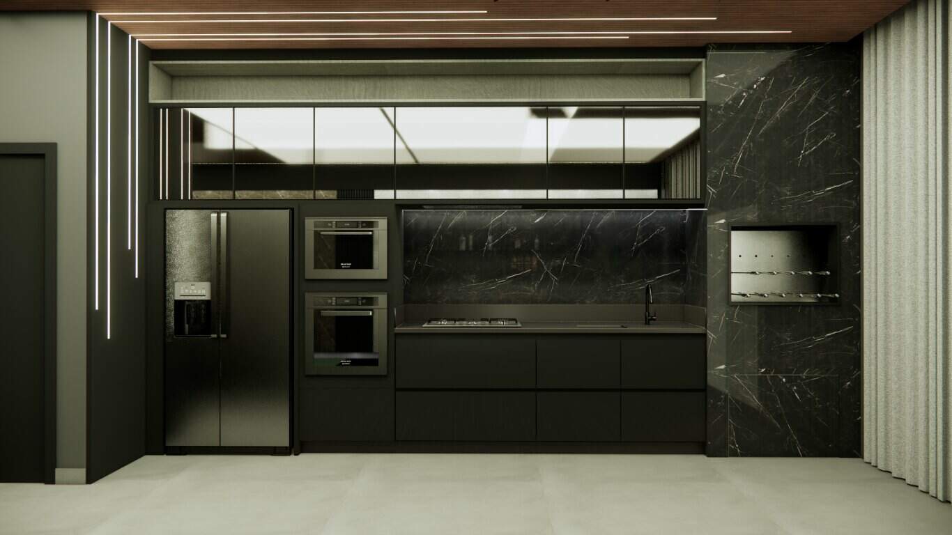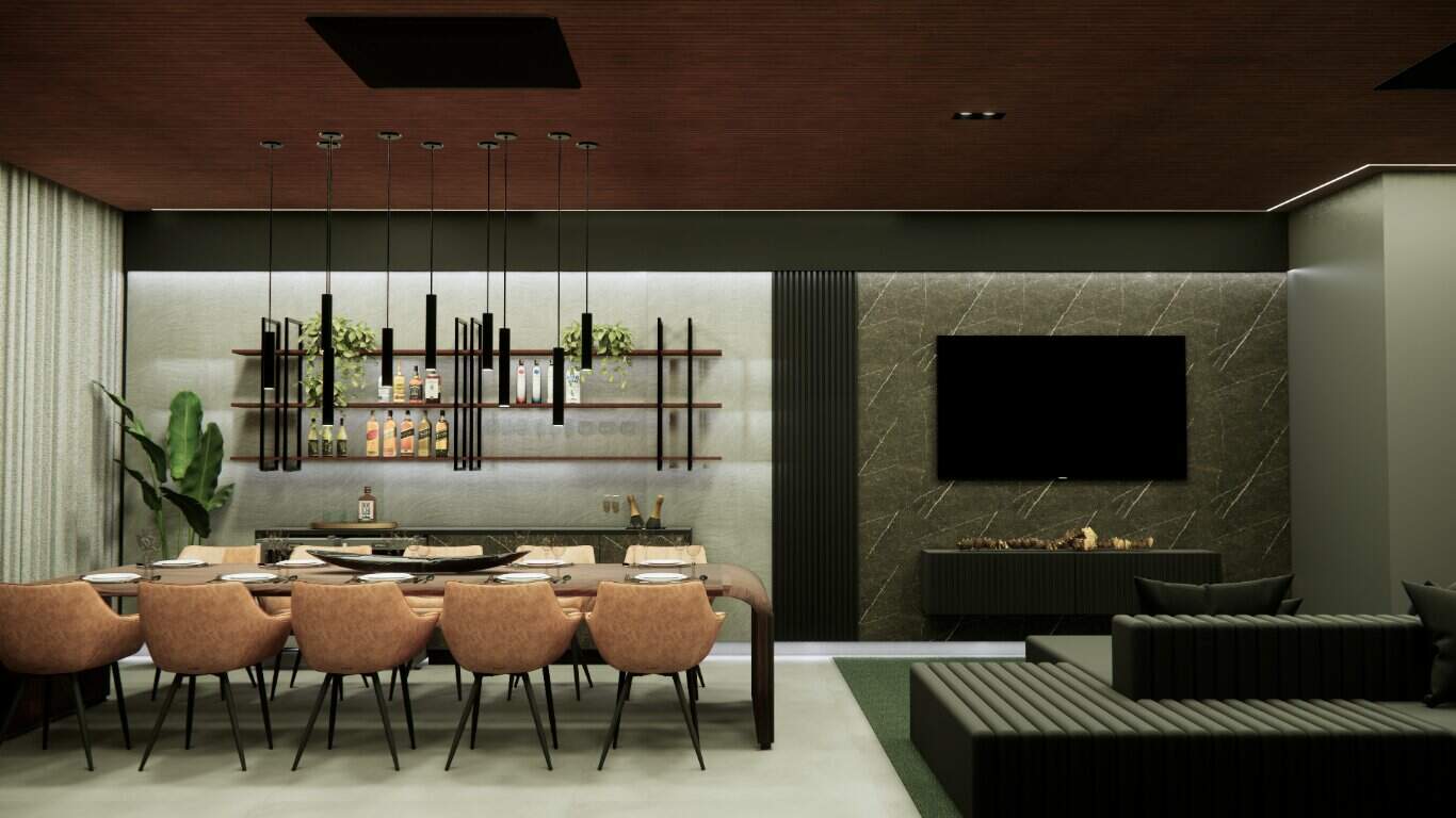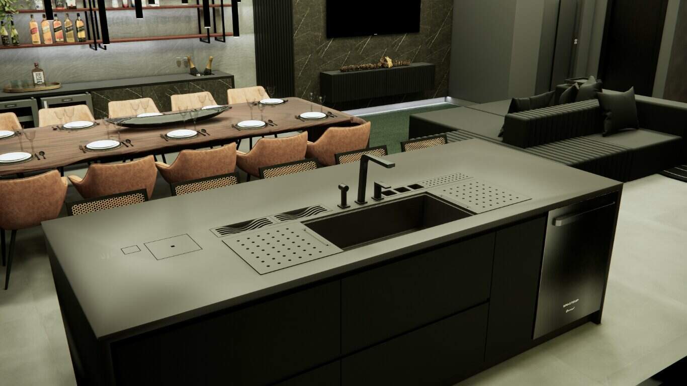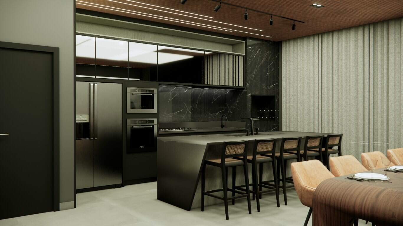 O design integrado da sala e da cozinha promove um ambiente harmonioso e acolhedor, perfeito para momentos de convivência.