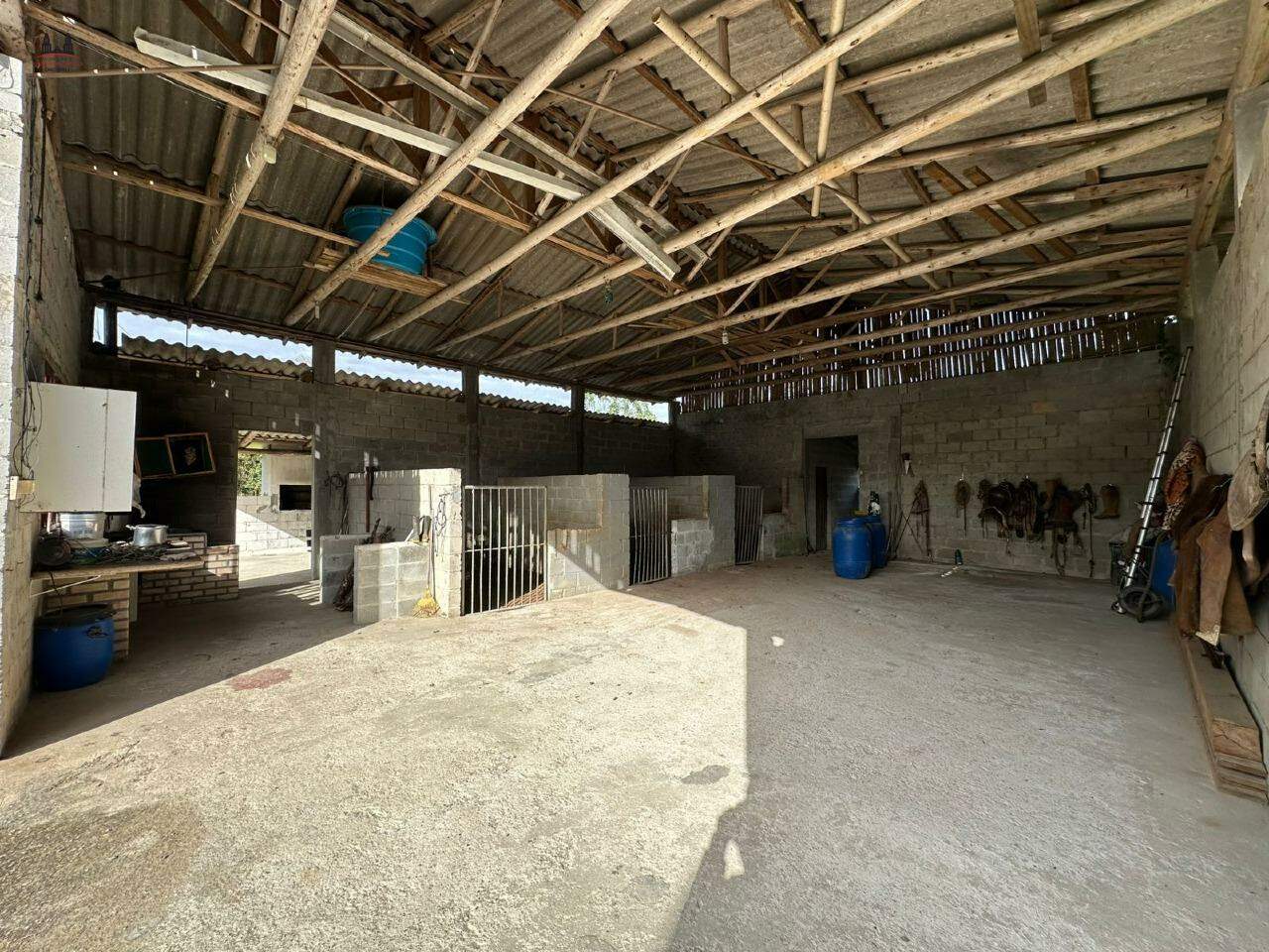Galpão estilo barracão com aproximadamente 130m², incluindo baia para cavalo e espaço para guardar ferramentas e equipamentos